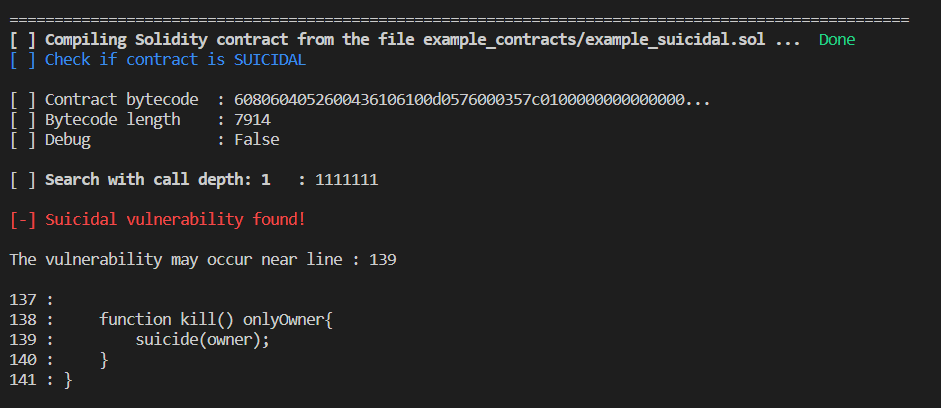 例如,检测input文件夹下 suicide.solSolidity文件中的主合约KAI是否存在自杀合约漏洞,使用以下命令: