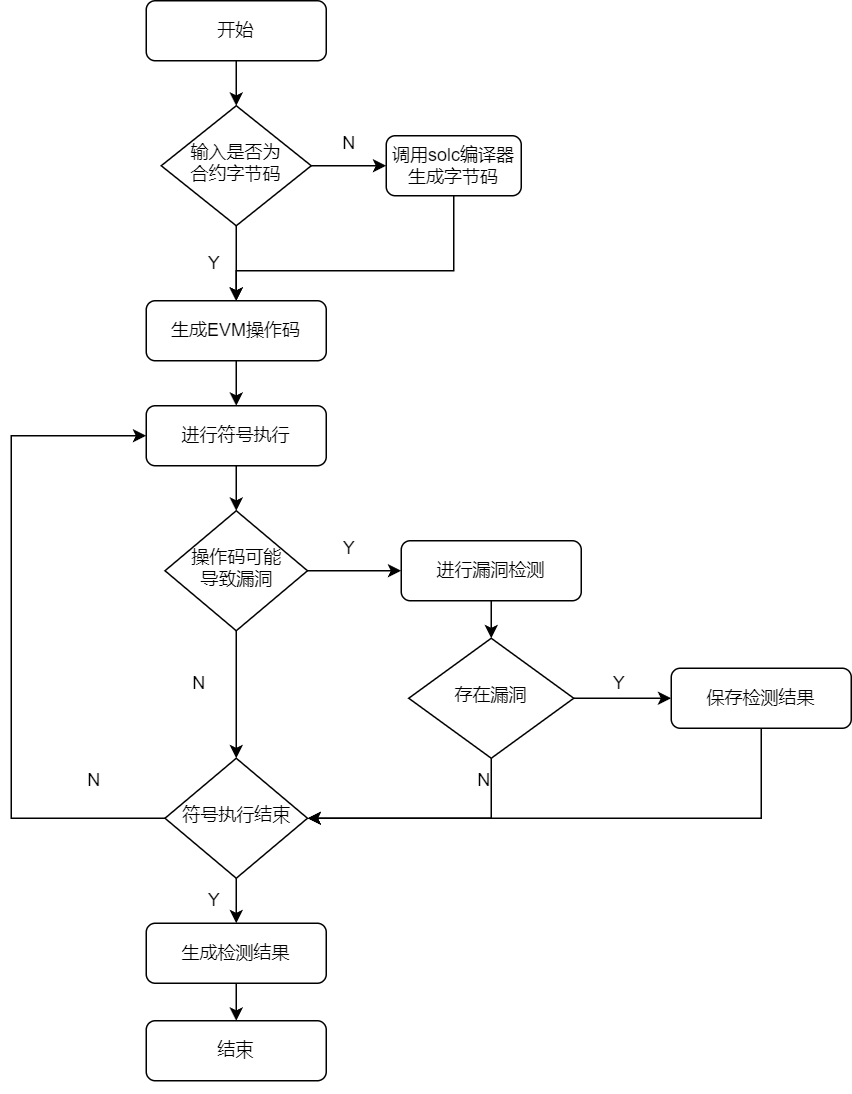 其中漏洞分析模块和符号执行模块是交叉执行的,当符号执行结束时,整体漏洞检测工作也即完成,最后会生成相应的漏洞检测报告。