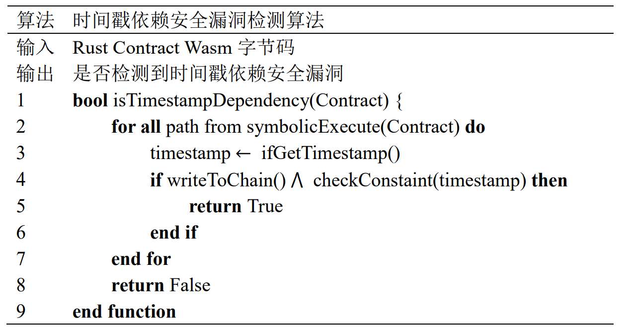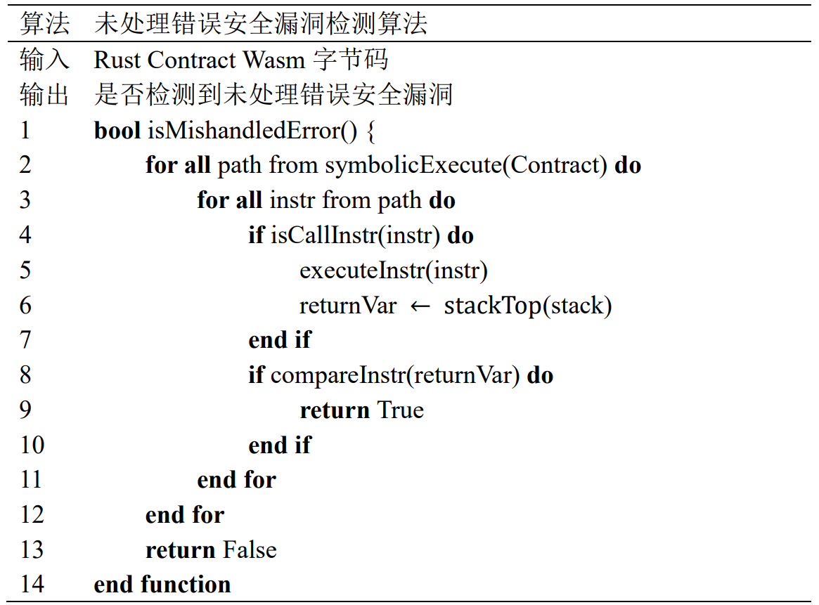 WANA的漏洞检测的执行过程通常由两部分组成,第一部分是预处理阶段,这一阶段发生于符号执行之前。这一阶段中,WANA会对Wasm实例进行静态分析以获取相应信息、定位漏洞相关函数、分析函数签名等。此部分的操作将辅助后续的漏洞检测阶段;第二部分是符号执行过程中的对程序分支路径的遍历以及对分支路径信息的收集。在遍历路径的过程中会进行特征检测,根据预定义的漏洞检测规则对路径信息进行可满足性判断。如果漏洞检测模块中发现了相应的漏洞,则会将相应的漏洞信息传入结果分析模块。