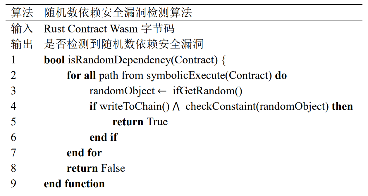 如表所示:这是一个简化的抽奖合约,第3-4行采用Rust的rand库生成了一个范围在0-10的随机数,第5-7行进行判断,如果该随机数大于5,则代表用户中奖了,调用资产管理合约并执行后续的转账操作。然而,由于所生成的随机数的结果是不确定的,所以区块链系统内的共识节点的结果也是不一致的。若共识无法达成,则此次合约调用的结果将是无效的。