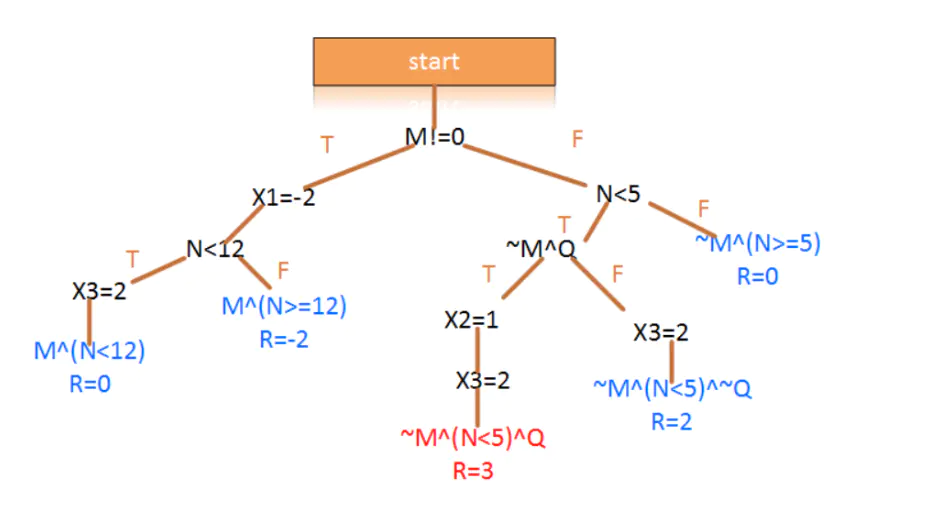 这段C语言代码接收M、N、Q三个变量作为输入,输出是x1,x2,x3三个变量之和。程序内部又包含了若干个分支,不同输入下会走不同的分支。 传统情况下对这段代码进行测试,需要构造若干组M、N、Q的输入,以覆盖程序的所有执行分支,然而对于分支庞大的程序,这样会有巨大的测试开销。 符号执行技术,会用抽象的符号值代替具体的输入值来进行程序的测试。程序的输入就是M、N和Q。在执行时遇到分支时,会自动分裂为左右两个分支,同时携带上约束条件,探索不同分支的后续执行。如图所示: