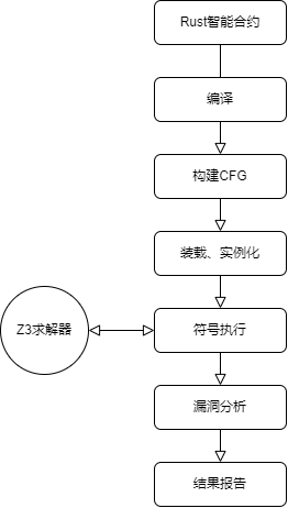 一方面Z3求解器可以用于遇到分支指令时进行约束求解以对符号执行过程进行剪枝,另一方面Z3求解器可以用于发现Rust应用漏洞时反向求解,获取能够进入此漏洞分支的输入值或输入范围。