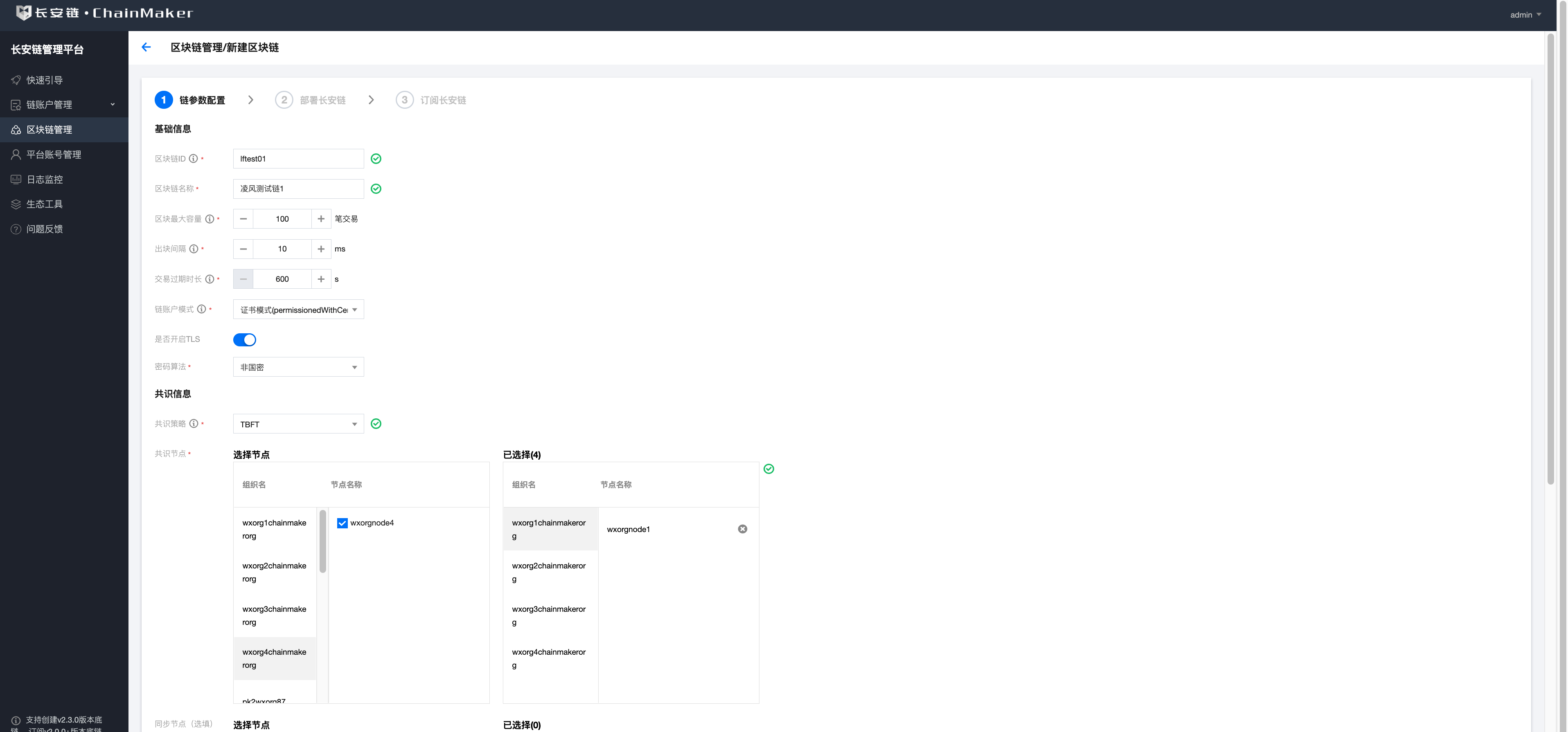 申请链配置文件前,请先确保,所需的组织和节点证书已经申请/导入本管理平台。