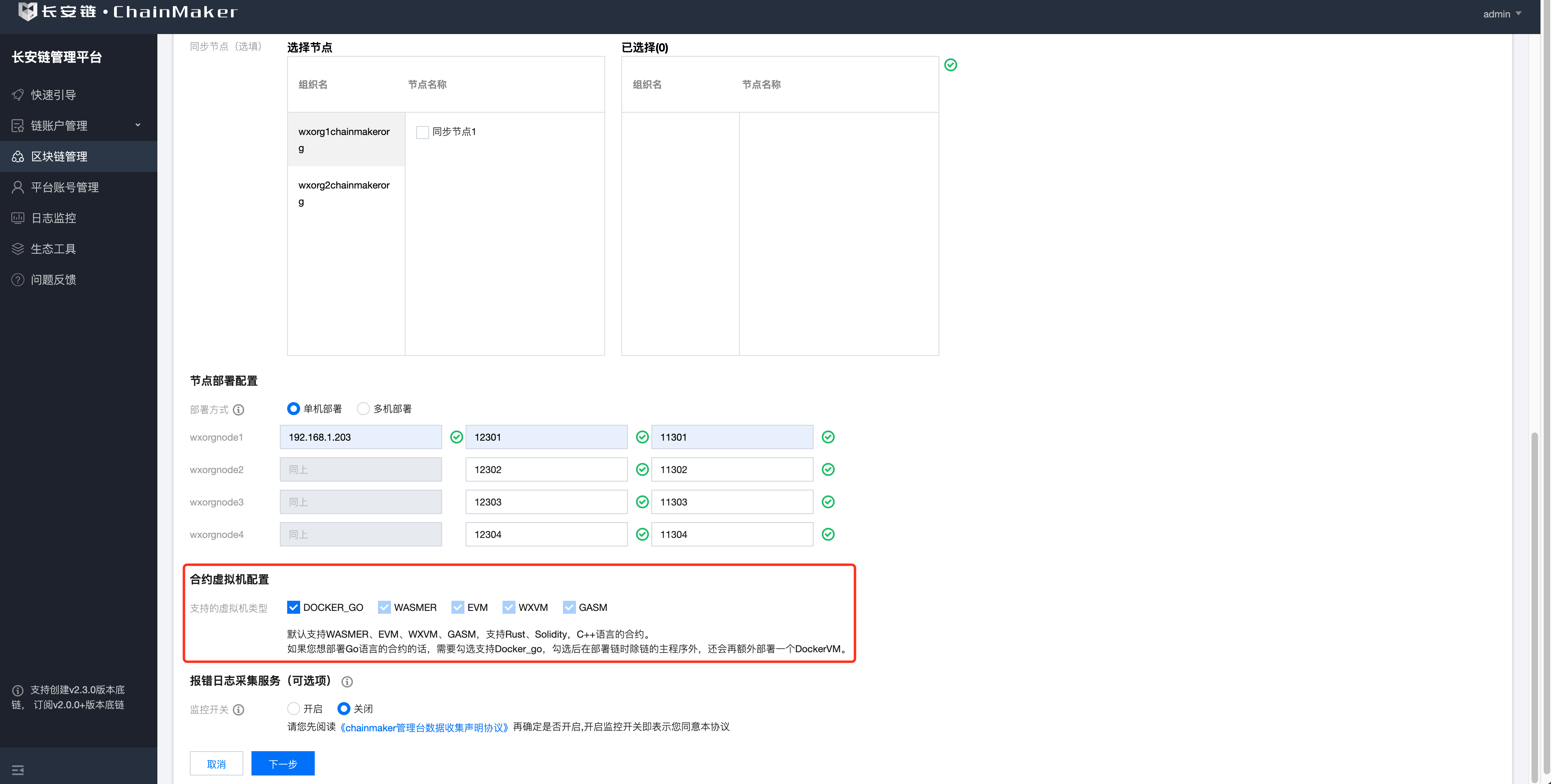 支持单机部署和多机部署,请正确填写所要之后要部署区块链节点的机器所在的ip,并确保端口不冲突。