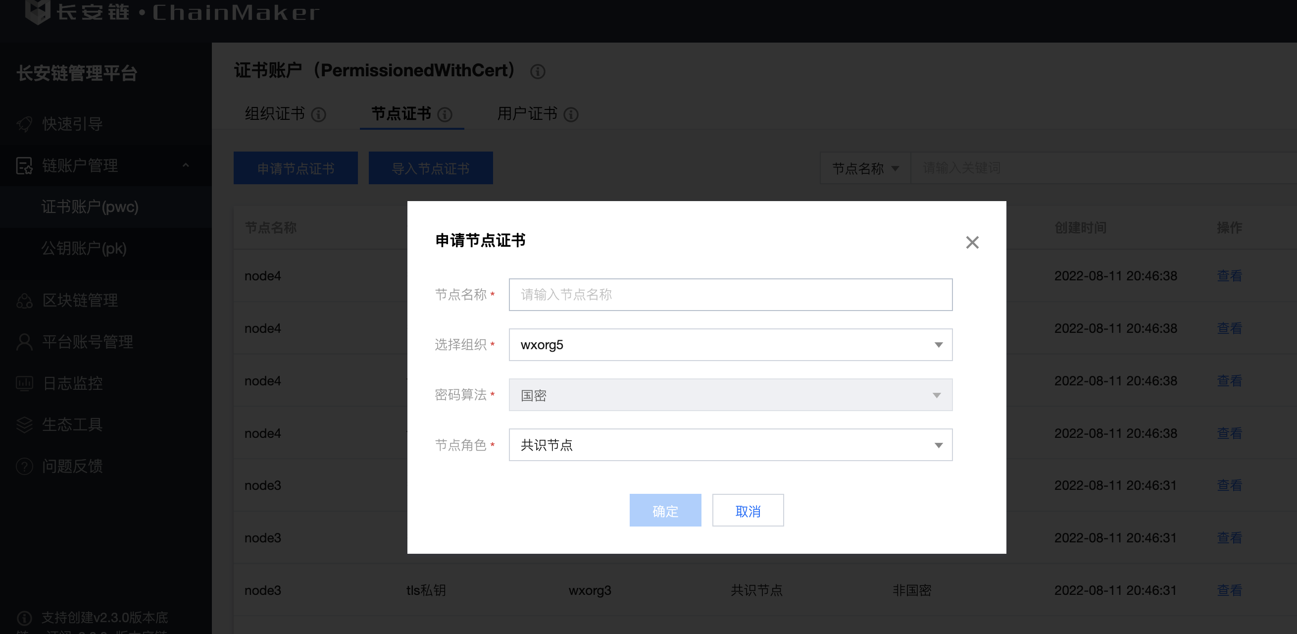 通过填写节点名称、组织信息,节点角色,申请节点证书。