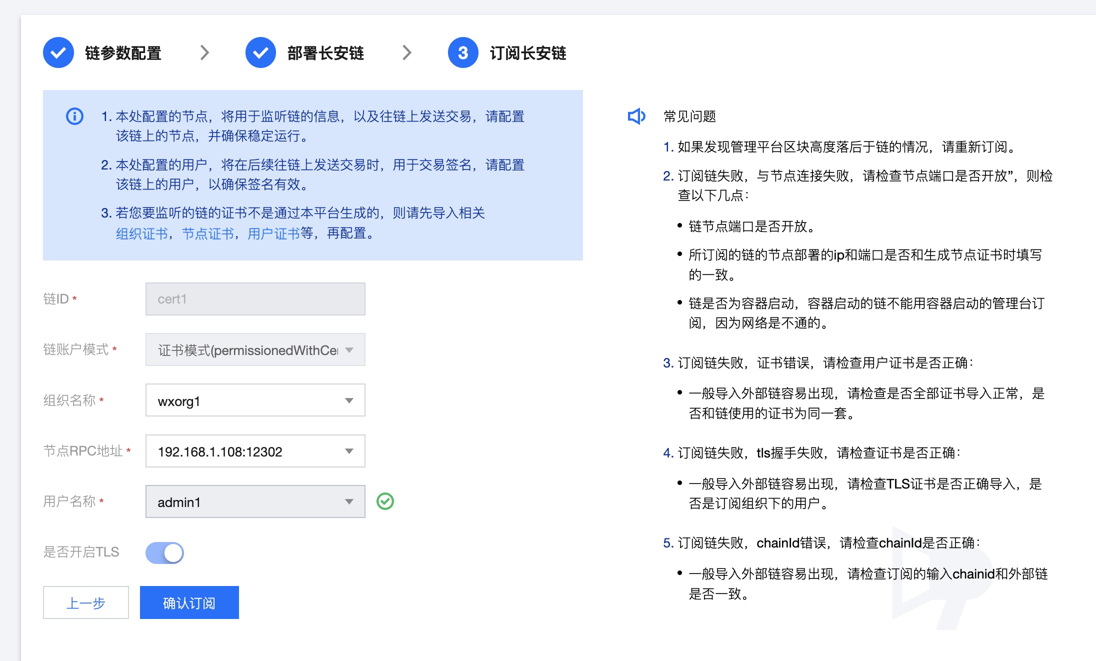 链部署成功之后在管理台进行快速订阅