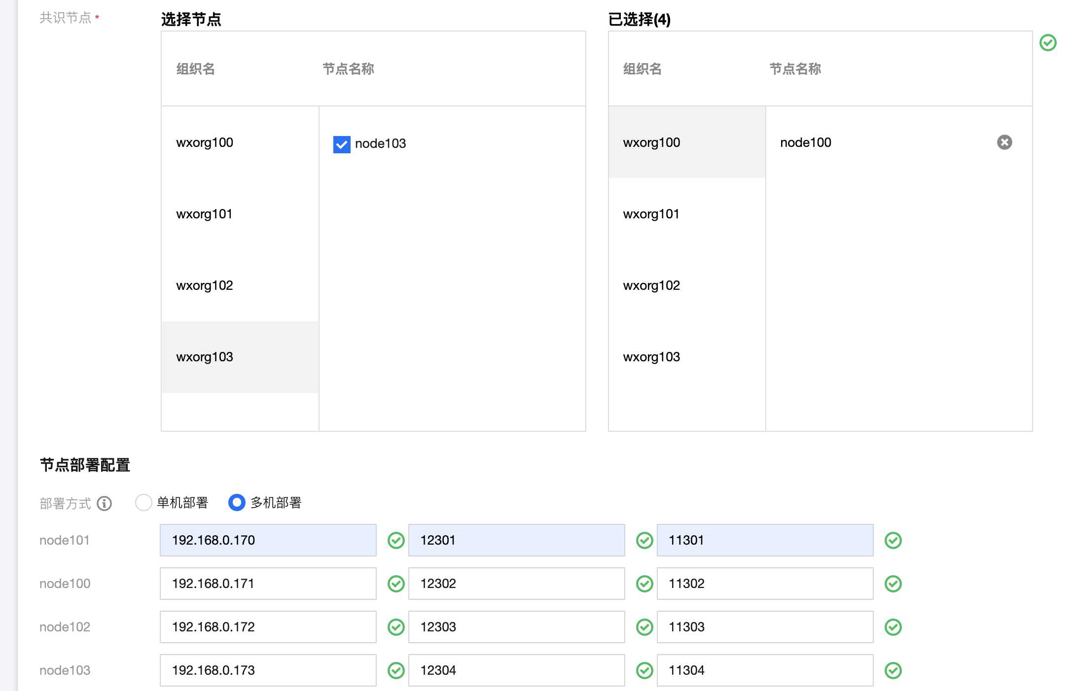 节点部署选择多机部署,使用不同的ip