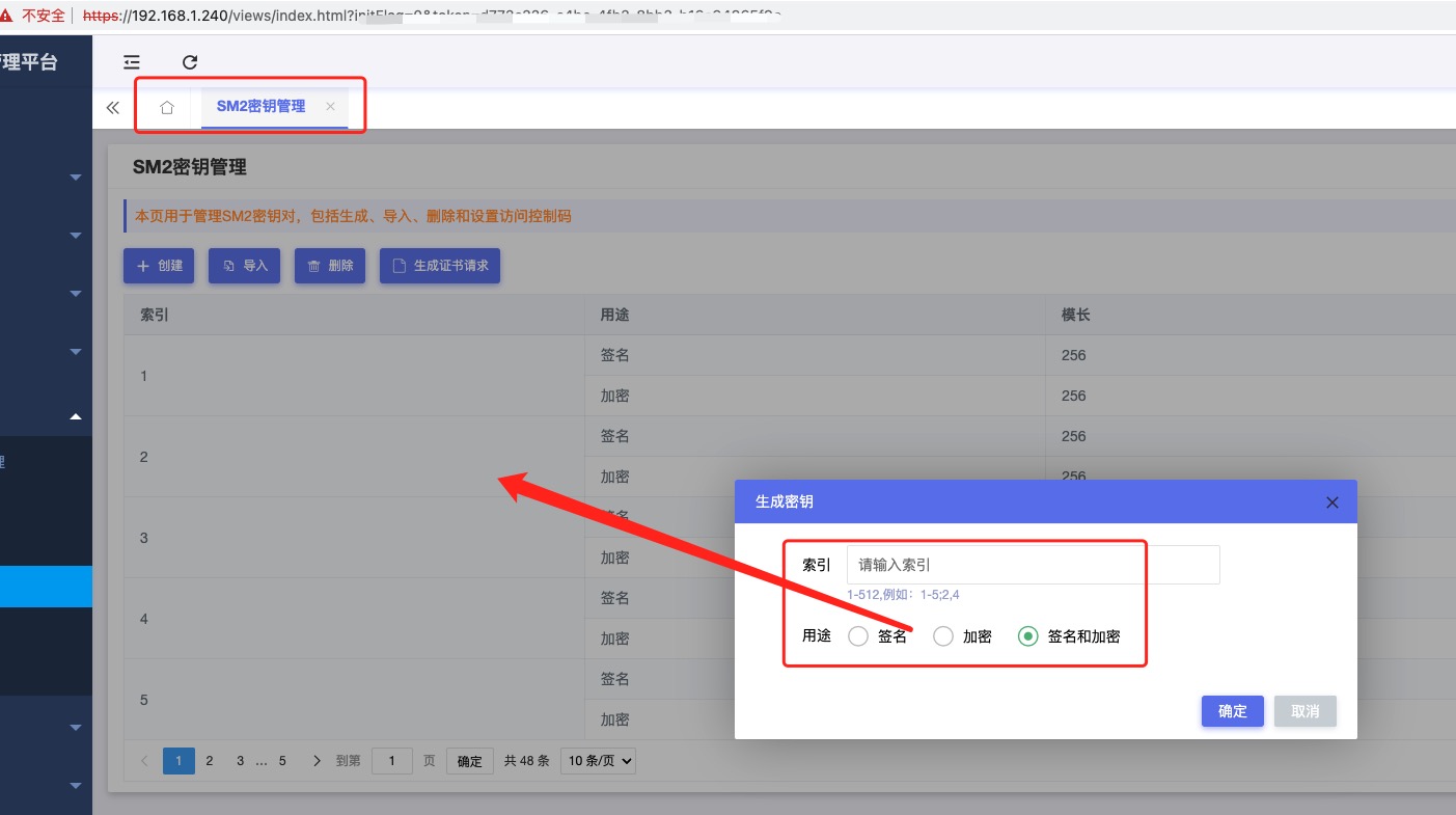 前置条件:已经存在某厂商(本文示例中使用三未信安)提供的硬件加密机,在其提供的配置服务中,添加好对应的密钥(以SM2密钥为例):