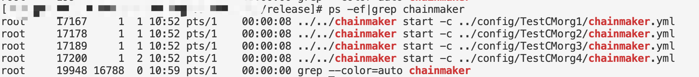 在区块链服务器中执行,如下命令确认4个节点进程存在,