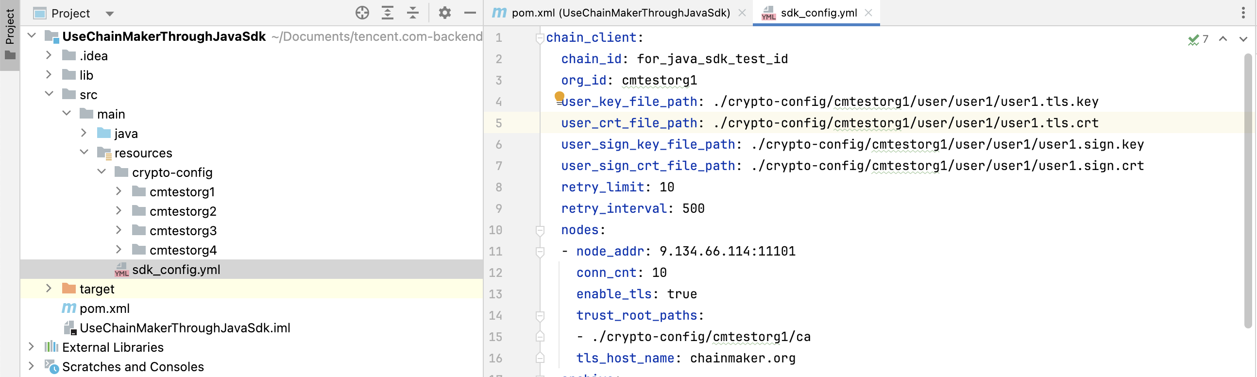 相关信息都获取并修改完成后,拷贝crypto-config(证书及私钥)和sdk_config.yml到resources,如下图: