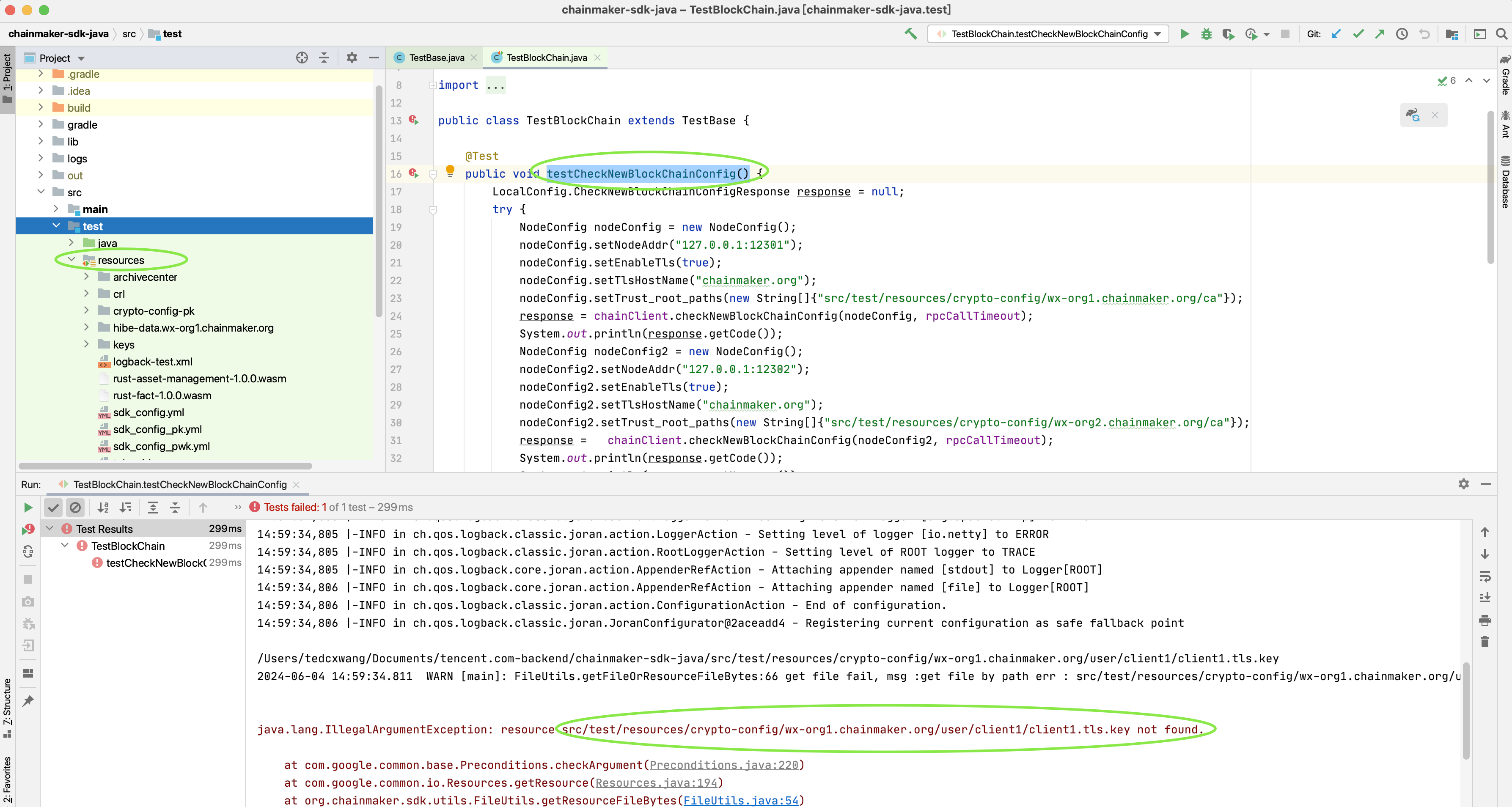 打开:src/test/java/org.chainmaker.sdk.TestBlockChain,运行testCheckNewBlockChainConfig()会出现如下错误: