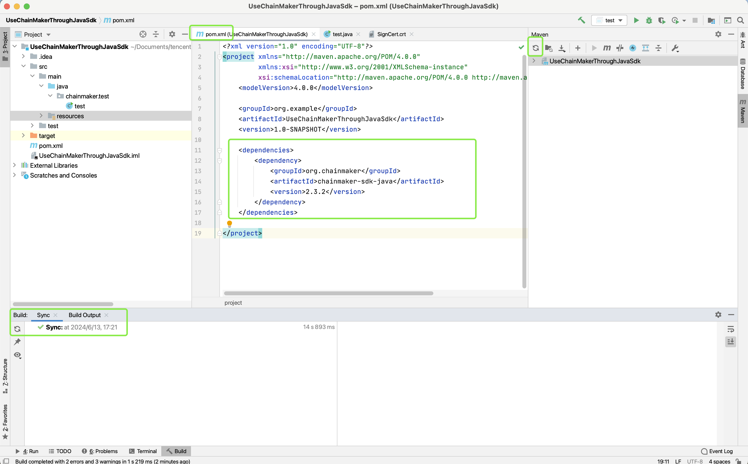 通过pom.xml文件在maven中引入chainmaker-java-sdk,并完成下载,如下: