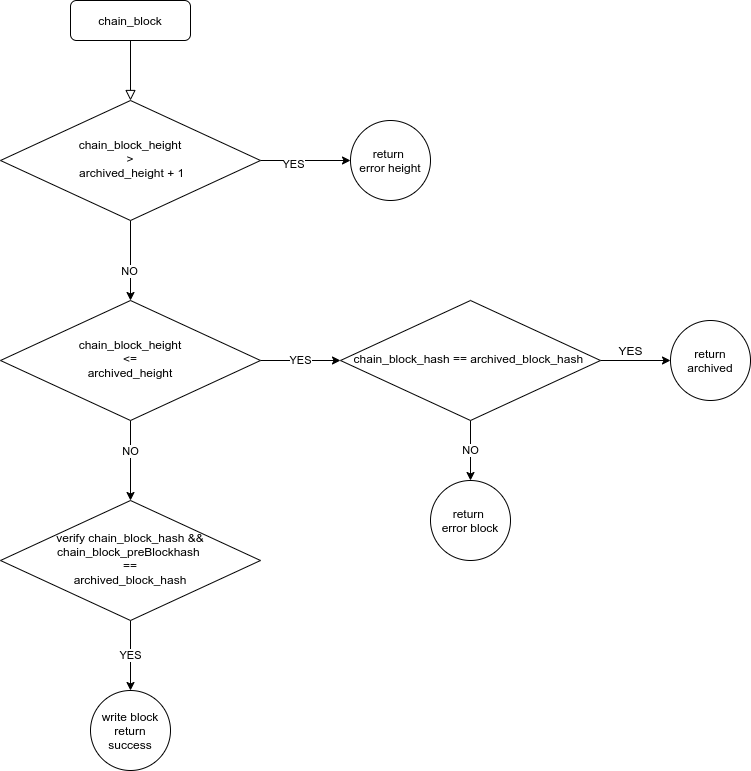 待归档区块的块高度和归档中心已经归档的高度,如果该区块与已归档的区块连不上,则报错。否则,检查该区块是否已经归档过。如该区块已经归档,则校验该区块hash是否和已归档的hash一致,如果一致则跳过,若不一致,则报错。若该区块尚未归档,则校验该区块hash是否正确,校验该区块指向的前一个区块hash是否正确。若正确则写入该区块数据,否则,报错。