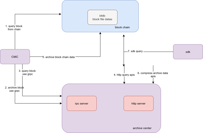 CMC工具,发送归档命令。该指令从链上查询出区块,将该区块数据通过GRPC传送到归档中心(对应下图步骤1,2)用户可以通过