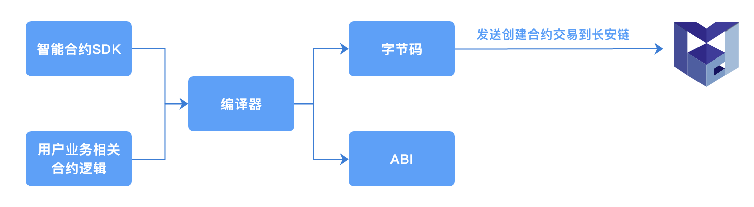 用户编写完成智能合约后,经过编译器编译为字节码,需要通过发送交易的形式部署到区块链上。发送的交易将被共识节点和同步节点接收和处理,在校验完成各项参数后,字节码将被存储在区块链数据库中。