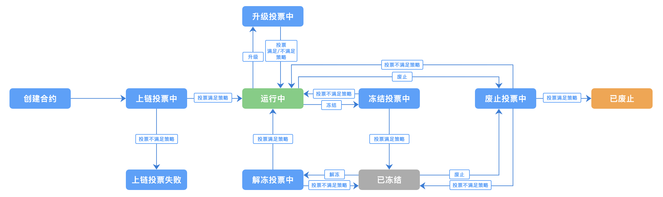 用户可以对已经部署在ChainMaker的智能合约进行冻结操作,需要发送冻结类型的交易,并指定合约名称,就可以冻结合约。被冻结的合约不允许被用户调用执行。合约冻结后可升级合约,升级后的合约依旧是冻结状态。