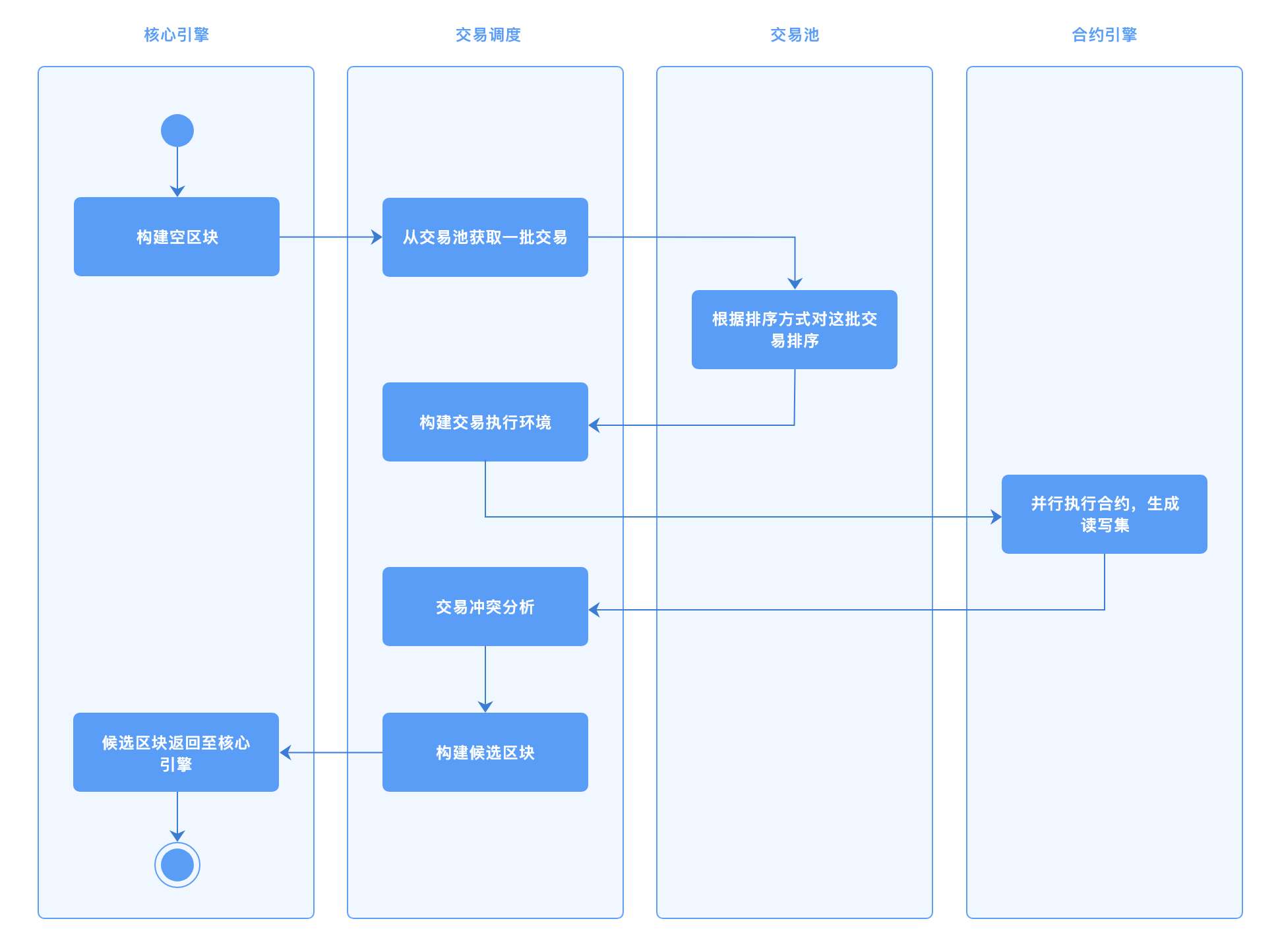 长安链支持多种智能合约编程语言和虚拟机,为虚拟机提供统一的数据访问和密码算法访问接口。当一批交易通过调度器被发送至虚拟机时,虚拟机将解析交易中的智能合约调用参数,并且在运行时,通过数据访问接口获取运行时必要的数据,最后执行生成交易的读写集、交易执行结果和交易执行的日志信息。