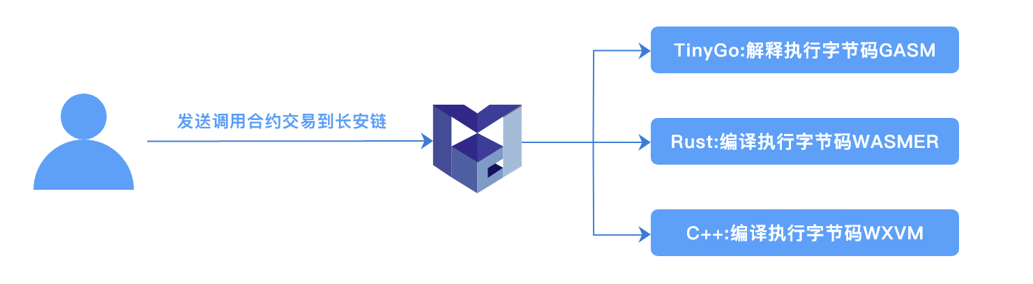 智能合约是一种计算机程序或交易协议,记录了交易条款信息、事件、行为,旨在减少对可信中间人的需求、仲裁和执行成本。在长安链上,用户可以通过高级语言(Golang、Rust、Solidity、TinyGo和C++)来编写智能合约,经过编译后,以二进制文件、WASM、EVM字节码的形式存储在区块链中,用户可以通过发送交易来触发执行智能合约中的代码。