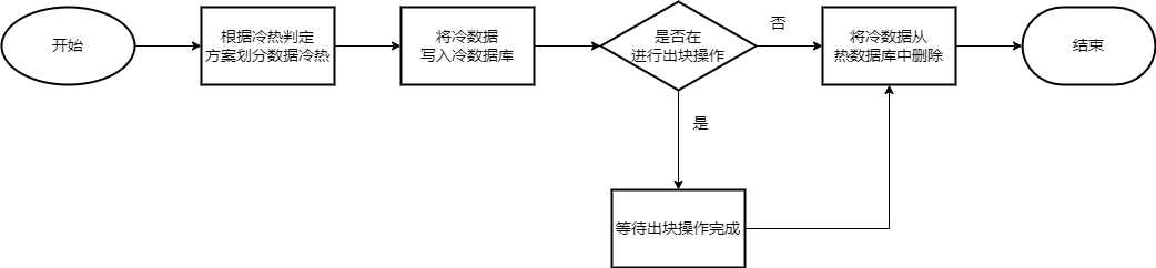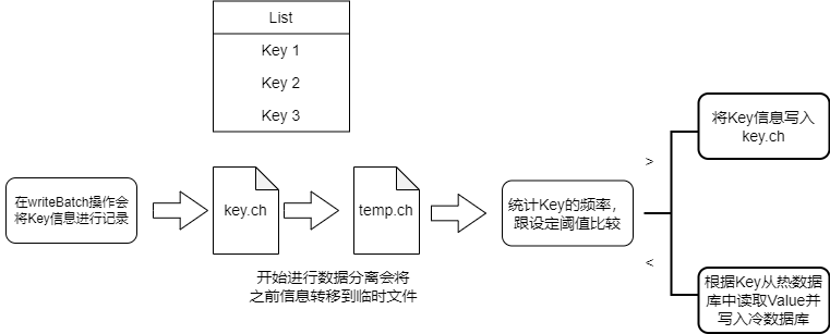 鉴于工程实践对于性能的要求,目前实现的冷热划分方案是依据数据的频率进行的,在统计新操作的数据的频率后,将操作频率较高前20%视为热数据,剩下的数据视为转变为冷数据,在之后进行迁移操作。具体流程如下: