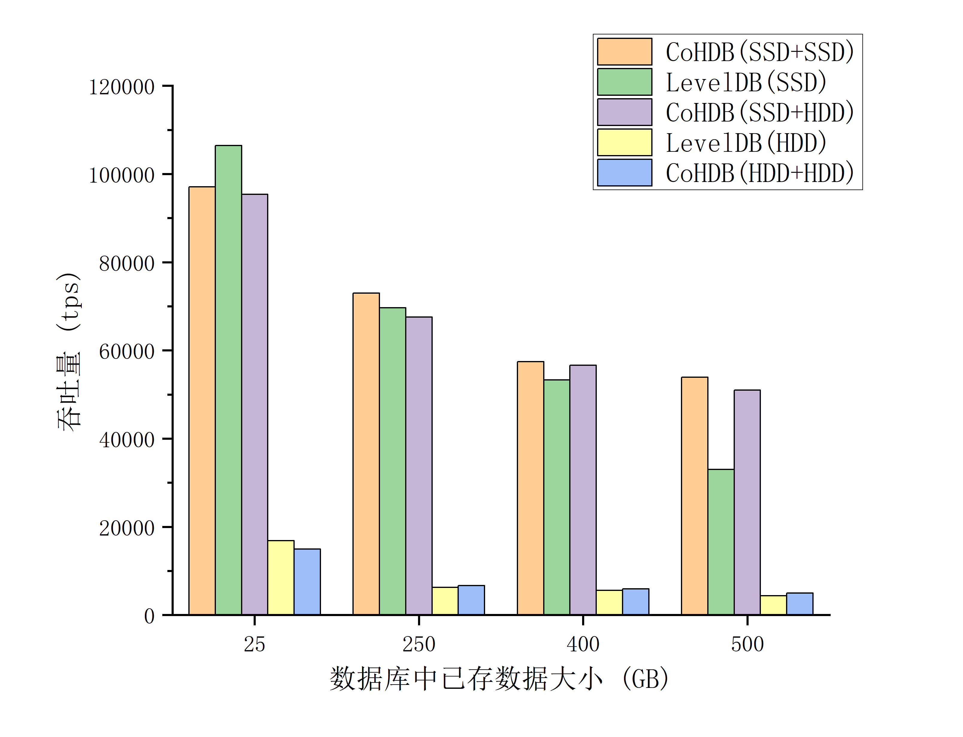 LevelDB数据库在存储介质SSD和HDD上存储性能操作差距明显,相同情况下吞吐量差距接近十倍。同时随着数据库大小的增加,进行存储的吞吐量也存在明显下降。这些表现符合使用冷热分级存储的预期。