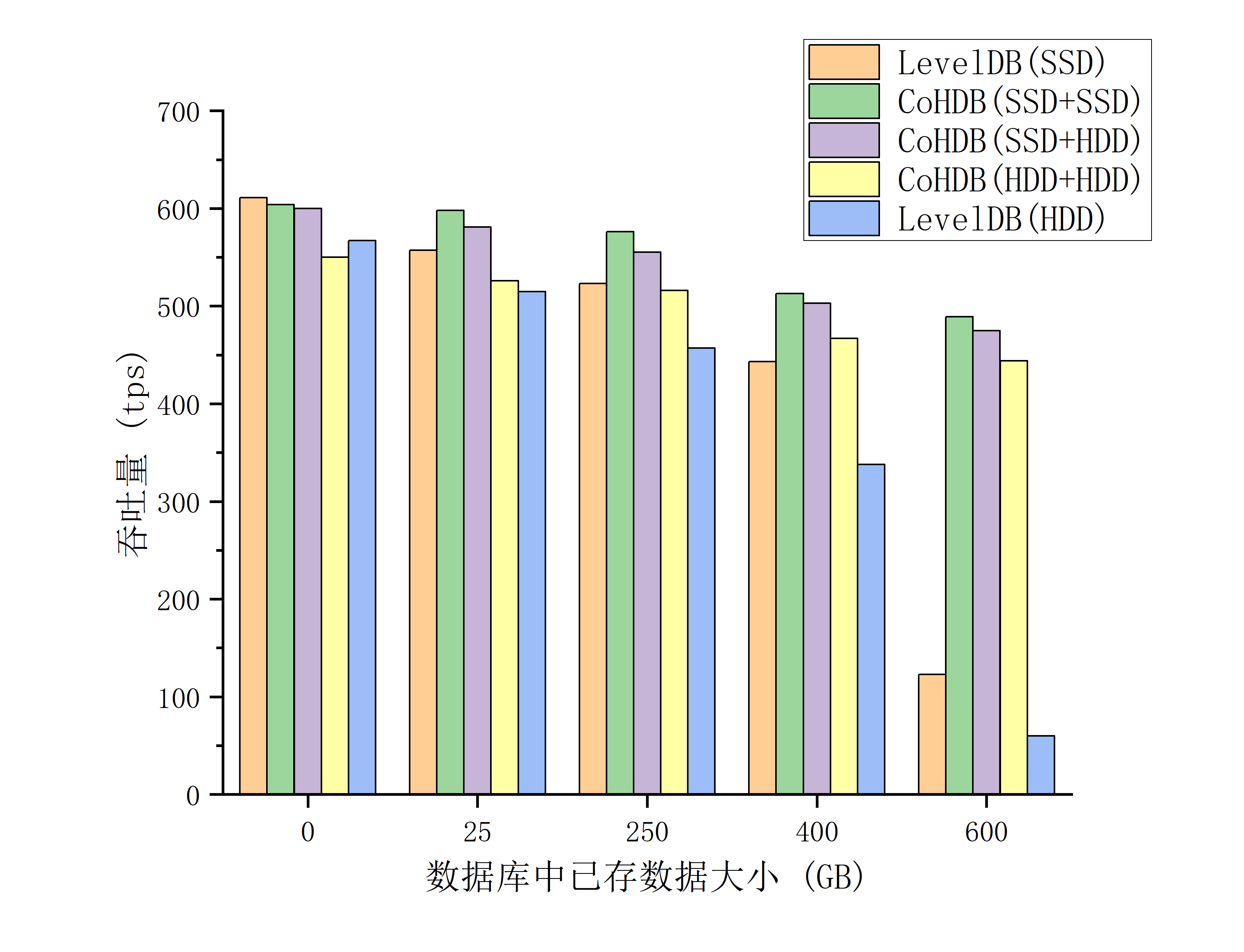 10%和12%。当数据库规模达到600GB时,使用ColdOrHotDB将数据存储在SSD和HDD时的吞吐量为使用LevelDB的