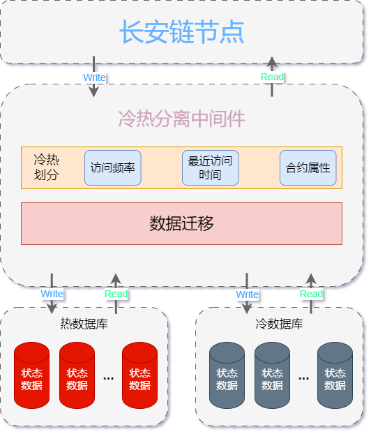 本模块通过在长安链存储模块状态数据库的基础上实现了一个冷热分离中间件。通过该中间件,将状态数据库进一步划分为热状态数据库和冷状态数据库,实现了状态数据库初始化、区块提交、数据的读取以及数据迁移等功能。