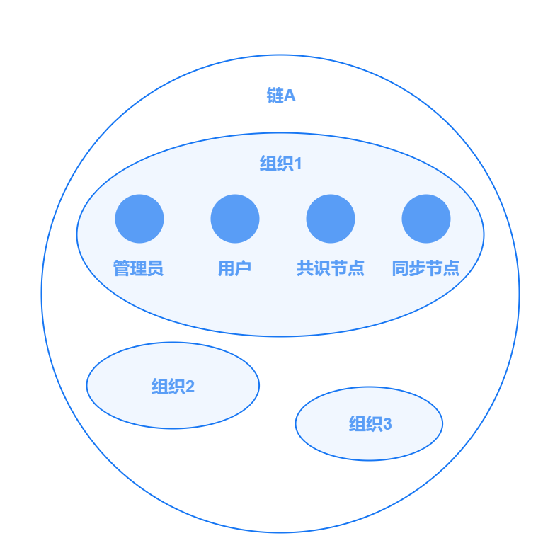 一条链由多个组织构成,每个组织下拥有一个或多个区块链节点和用户(类型详见下文中角色类型)。