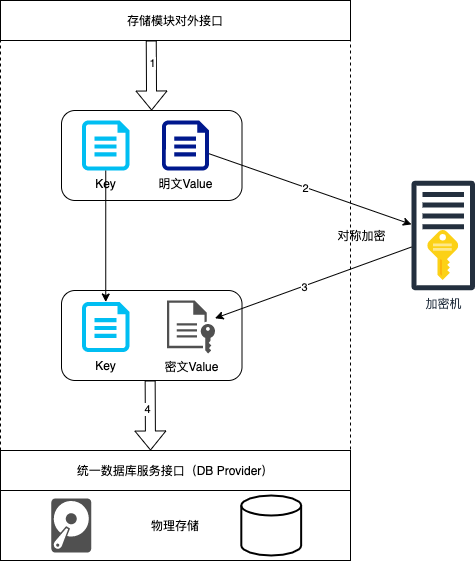 TDE需要一个密钥来加密和解密数据,这个密钥可以通过配置项的形式传入ChainMaker,也可以使用独立的文件来保存,同时也支持硬件加密机这种物理隔离高安全的密钥托管和加解密方案。 以配置为密码机进行透明数据加密的长安链为例,存储模块在收到存储KeyValue键值对的请求时,先将Value内容以二进制形式发送到密码机,密码机使用内置的密钥对收到的数据进行对称加密,并将密文返回给长安链存储模块。长安链存储模块将原来的Key和加密后的Value作为新的键值对,发送给底层的统一数据库服务接口DB Provider,由底层数据库服务接口调用具体的数据库引擎存储收到的键值对。