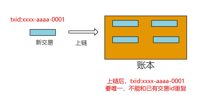 区块链账本中新交易都需要一个交易id,交易id必须全局唯一,不能和账本中的已有交易冲突(一样),因为区块链账本中交易不断增加,所以账本中累积的交易会越来越多。