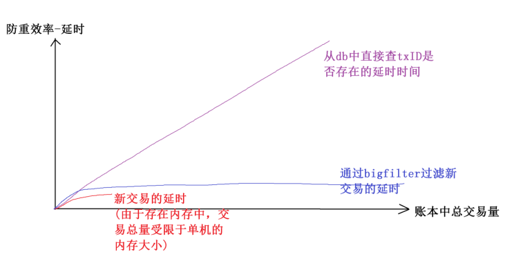 可以看到,bigfilter占用内存和磁盘空间相对是最少的,比直接存储原txid的方式效率是几十倍、甚至百倍的差距。 防重稳定性:是指随着账本中积累的交易数量不断增加,做一次新交易过滤需要花费的时间延迟是否会随着账本中总交易量的增加而显著增加。