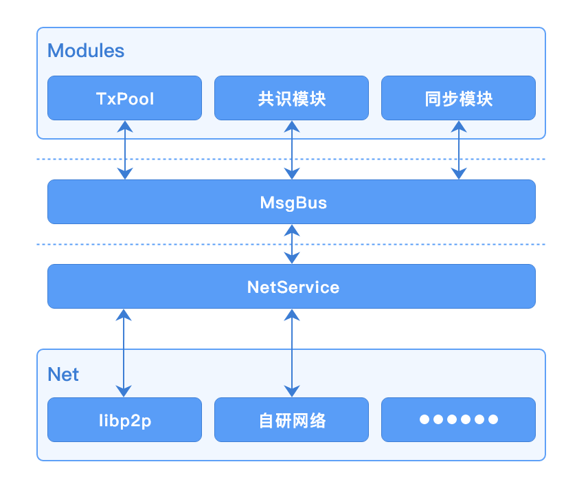 ChainNodeInfo是链上节点信息结构体,主要存储某个链上与本地节点建立连接的节点NodeID、网络地址、TLS证书等信息。MsgHandler是网络消息处理器,当网络模块收到来自其他节点或订阅的消息时,会根据消息类型回调给不同的消息处理器去处理接收到的消息。ChainNodesInfoProvider是链上节点信息Provider接口定义,主要用于给rpcServer或VM提供查询当前链已连接节点信息功能。NetService是网络服务接口定义,主要用于为其他模块提供网络服务支持。BroadcastMsg方法,向链内广播一条消息,需要指定消息类型。Subscribe方法,注册一个用于处理指定消息类型的订阅消息处理器,与BroadcastMsg配合使用。CancelSubscribe方法,注销一个用于处理指定消息类型的订阅消息处理器。ConsensusBroadcastMsg方法,向链内共识节点广播一条消息,需要指定消息类型。该方法只会把消息发给共识节点,非共识节点收不到该方法广播的消息。ConsensusSubscribe方法,注册一个用于处理指定消息类型的只发给共识节点的订阅消息处理器,与ConsensusBroadcastMsg配合使用。CancelConsensusSubscribe方法,注销一个用于处理指定消息类型的只发给共识节点的订阅消息处理器。SendMsg方法,向指定节点直接发送网络消息。ReceiveMsg方法,注册一个用于处理其他节点直接发送过来的消息处理器。Start方法,启动网络服务。Stop方法,停止网络服务。GetNodeUidByCertId方法,根据证书ID查询使用该证书ID对应的TLS证书节点的NodeID。GetChainNodesInfoProvider方法,返回ChainNodesInfoProvider接口实现。