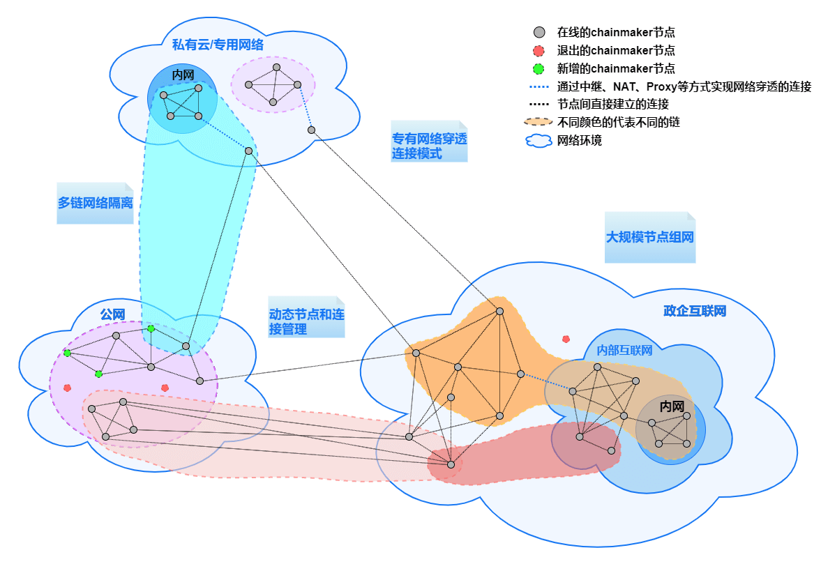 长安链可以针对复杂网络环境场景提供组网通讯解决方案,包括但不限于NAT穿透、代理节点转发等。